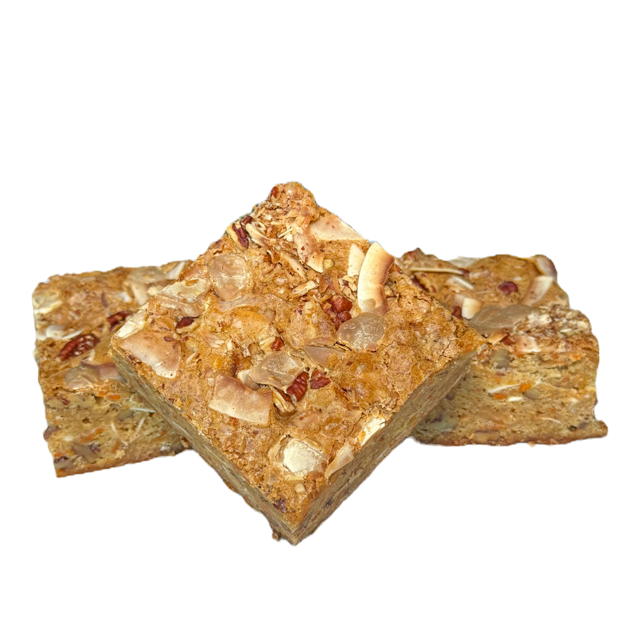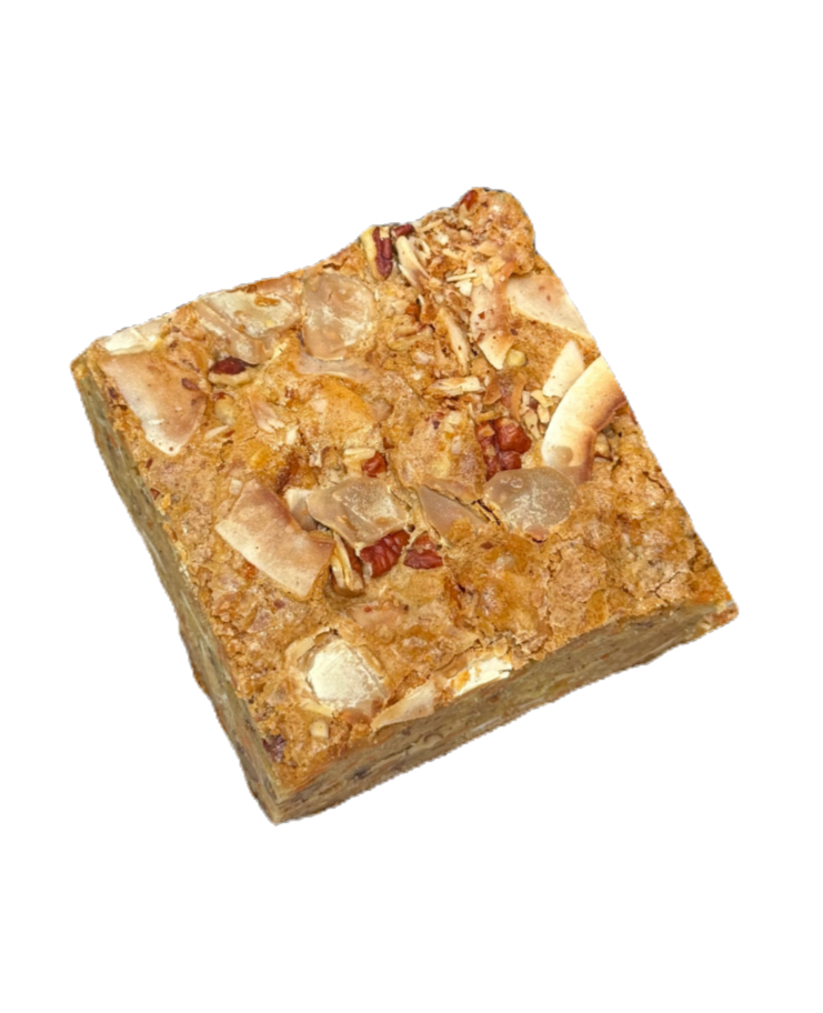 All the cozy flavors of classic carrot cake, reimagined as a rich, buttery blondie. Made with warm spices, sweet carrots, toasted pecans and coconut, and finished with swirls of tangy cream cheese for the perfect balance of sweet and creamy. Each bite is pure comfort with a touch of indulgence.